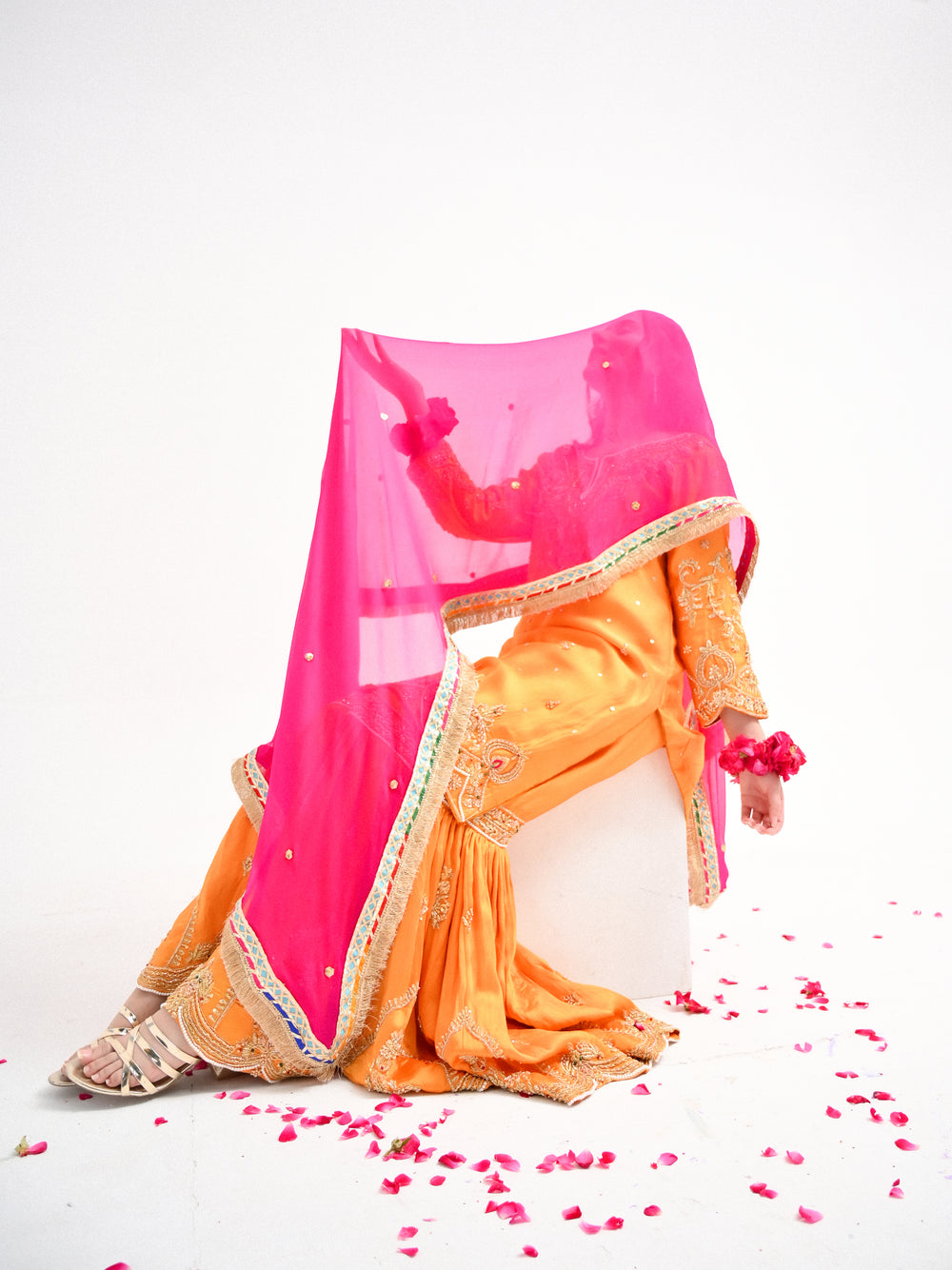 “Shahnai-e-Rang is a vibrant celebration of festivity and joy, crafted in a radiant yellow-orange hue that captures the warmth of traditional ceremonies. Paired with a striking hot-pink dupatta adorned with delicate accents, this ensemble reflects the true spirit of cultural elegance. Intricate golden embellishments add a touch of sophistication, creating a look that is lively yet gracefully refined. Shahnai-e-Rang is designed to illuminate every festive moment, making it the perfect choice for celebrations filled with color, tradition, and heartfelt charm.”