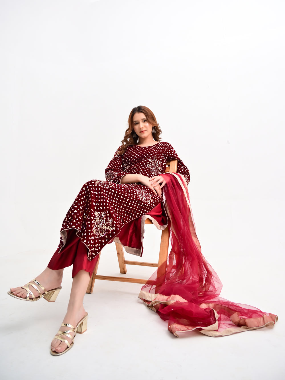“Velvet-e-Ishq is a captivating ensemble crafted in rich maroon velvet, designed to embody elegance with a touch of romance. Its shimmering hand-embellished motifs softly illuminate the deep velvet base, creating a stunning interplay of texture and light. Paired with a graceful dupatta and sleek trousers, the outfit speaks of refined charm and timeless sophistication. Velvet-e-Ishq is made for moments that celebrate beauty, emotion, and unforgettable style — a look that leaves a lasting impression with every glance.”
